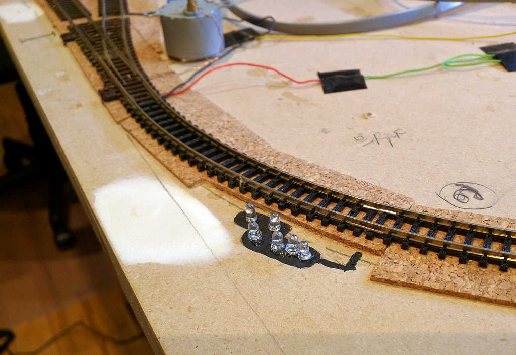 Sémaphore (= rouge). Un second train venant de la droite à la suite de la locomotive serait obligé de ralentir puis de stopper.